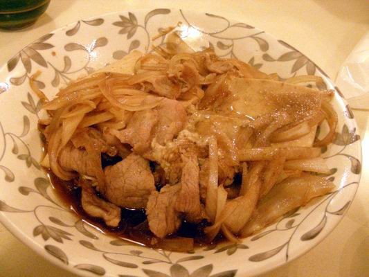 很豐盛的一盤豬肉片、洋蔥、粉絲及大量的豆腐